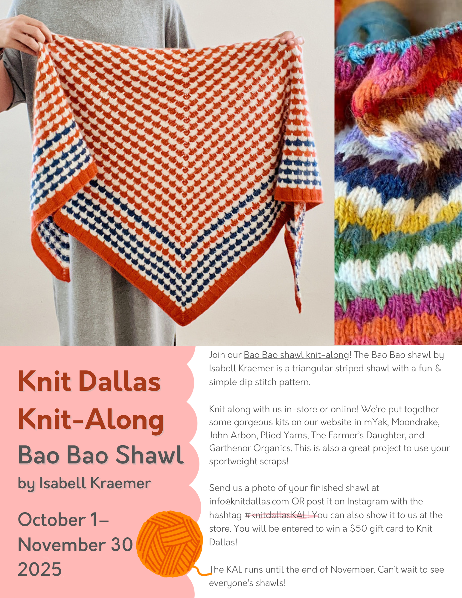 Join us October & November to make this super fun shawl! Kits available online!