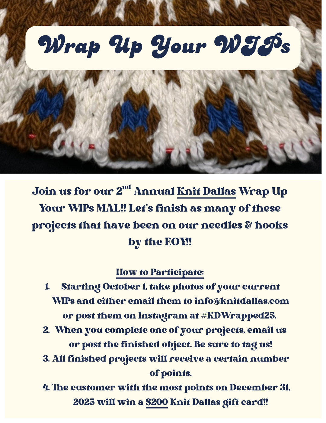 Join us for our 2nd Annual Knit Dallas Wrap Up Your WIPs Make-Along!!