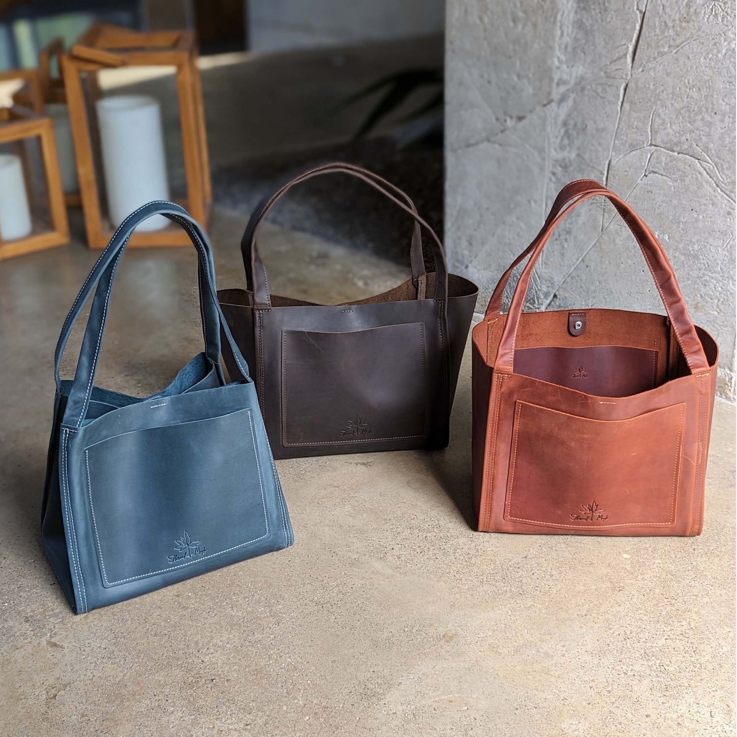 The inner walls of the bag are unlined, leaving the underside of the velvety leather exposed. Each tote comes with a small square wool felt pad that you can use to buff out any scuffs or scratches.
