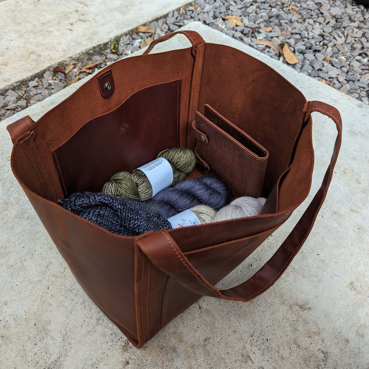 This boxy tote stands on its own--open or snapped closed--on any surface. Wide straps allow the bag to sit comfortably on your shoulder (no matter how much you've stuffed inside). With 2 large pockets on the outside and 3 pockets on the roomy inside, you'll have space and place for all your notions, a Project Page, and a Stephen West-size shawlanket or two.