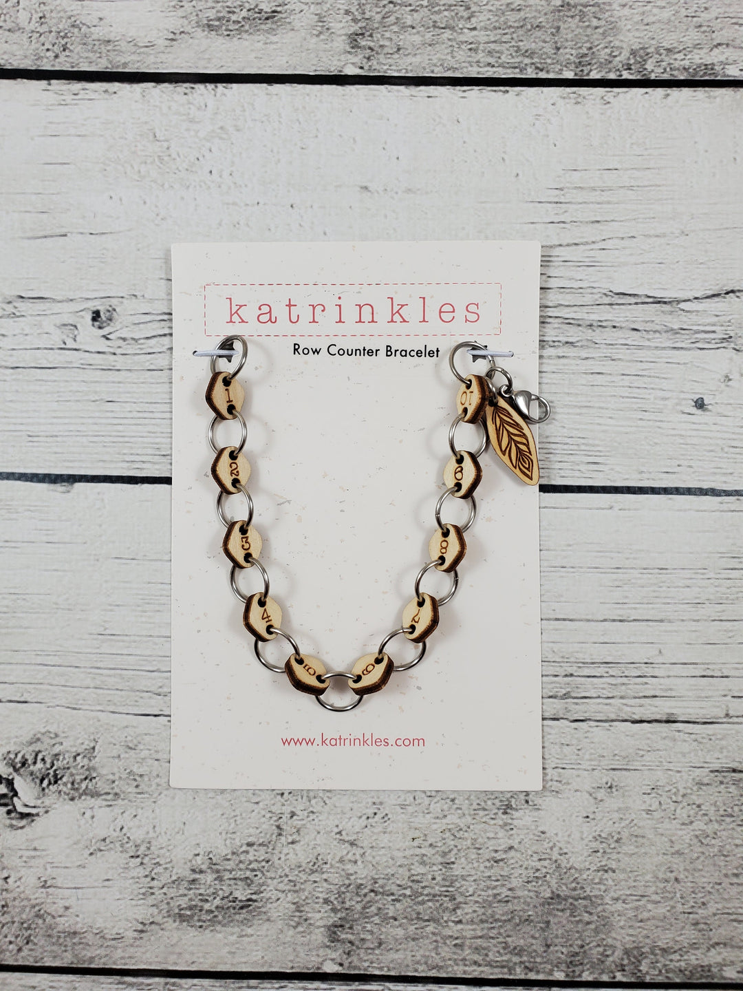 Katrinkles Row Counting Bracelet makes keeping track so much easier! Each link in the bracelet has a number etched into the wood - slip the ring onto your needles like a stitch marker and the number hanging below will tell you which row you are on.