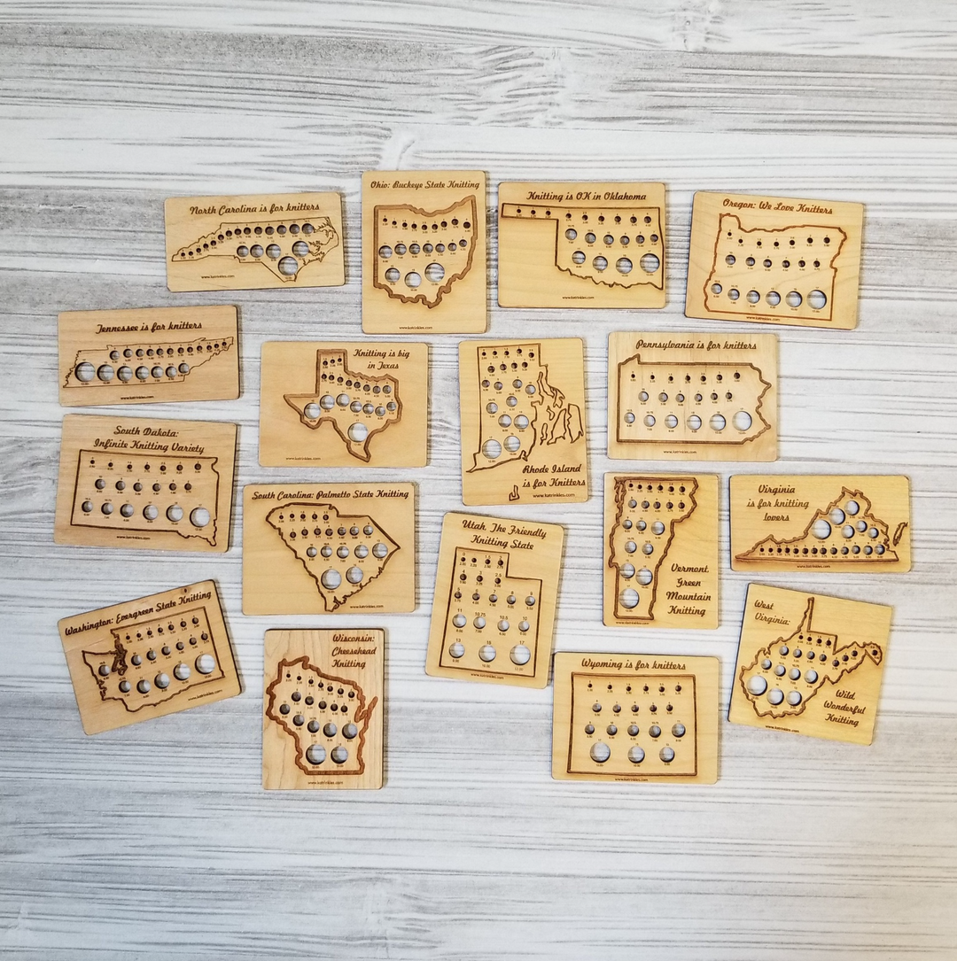 The precise holes are laser cut from a local hardwood, perfect for measuring knitting needles from sizes 0 to 17. Both the US sizes and metric measurement are clearly etched above and below each hole to ensure it is universal for every knitter.
