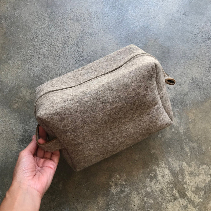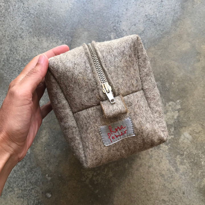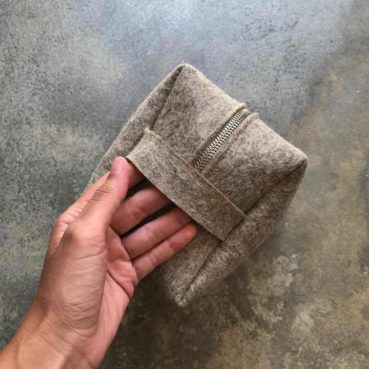 Versatile travel bag in wool felt with metal zip. This pouch has plenty of space and can be used to carry a variety of small items such as toiletries, knitting or sewing accessories, stationery essentials, and much more. It is also easy to carry in a medium-size handbag or backpack, to use as a purse organizer and to keep any essential belongings secure. Ideal for both travel and day-to-day use.